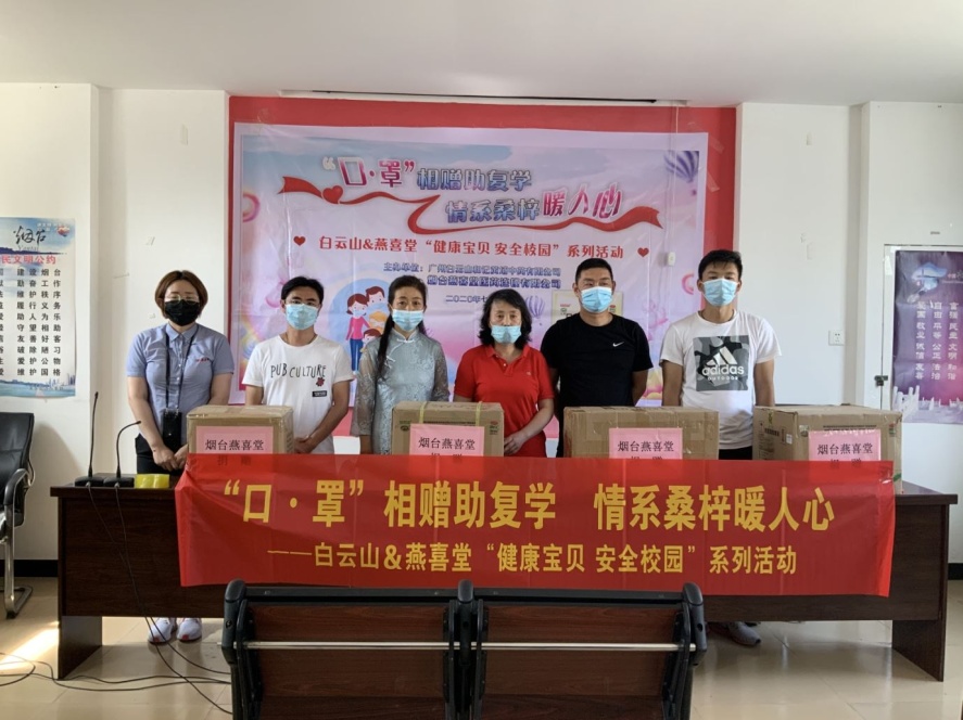 护航校园生活,2020年7月9日,广州白云山和记黄埔中药有限公司和烟台燕喜堂医药连锁有限公司发起公益活动,向芝罘区某小学捐赠价值五千余元的学生口罩、感冒清热颗粒、藿香祛暑软胶囊若干及酒精棉签一批,助力青少年儿童平安成长,保障校园安全。