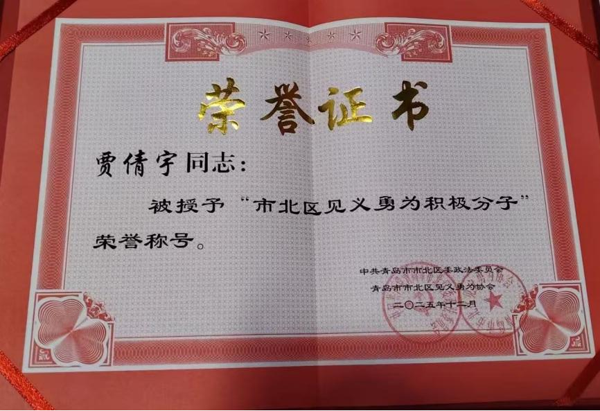水母网1月15日讯(通讯员 李成修 侯瑞 )近日,烟台毓璜顶医院莱山院区手术一部护士贾倩宇收到了青岛市市北区委政法委寄来的“市北区见义勇为积极分子”荣誉证书。“真没想到这么一件小事,还能获得官方表彰,挺惊讶也有点不好意思。”谈及这份荣誉,贾倩宇朴实的语气中带着一丝腼腆。
