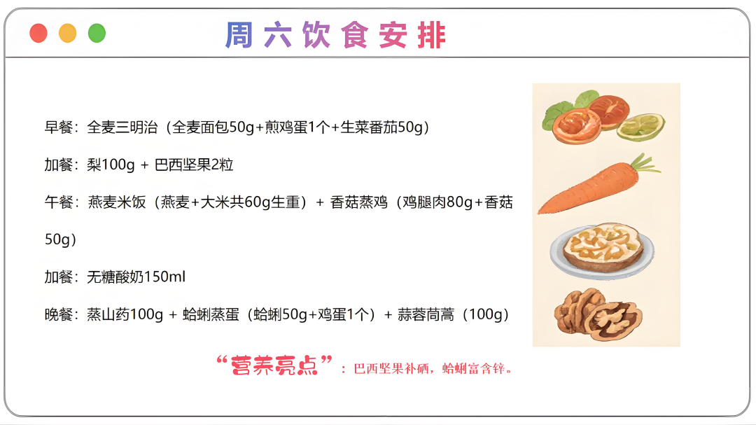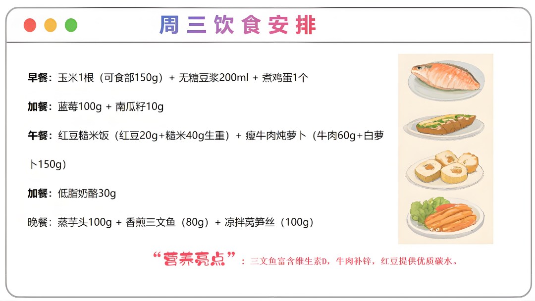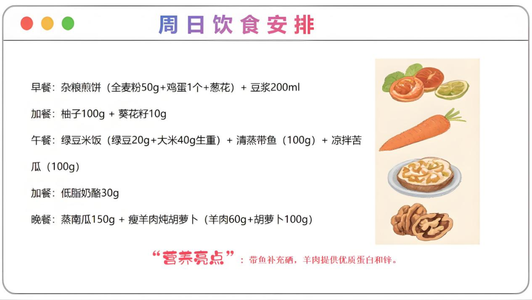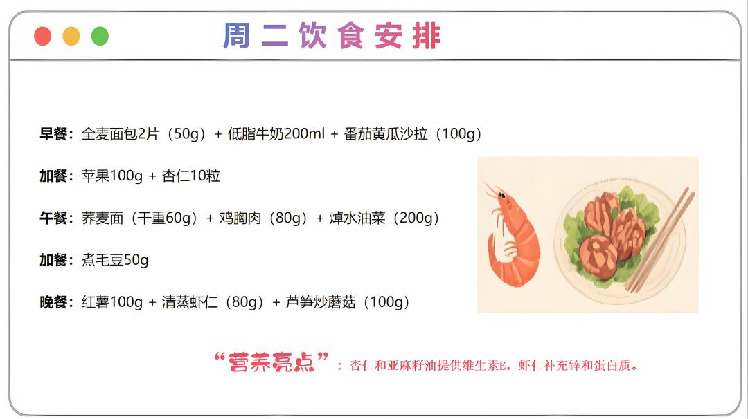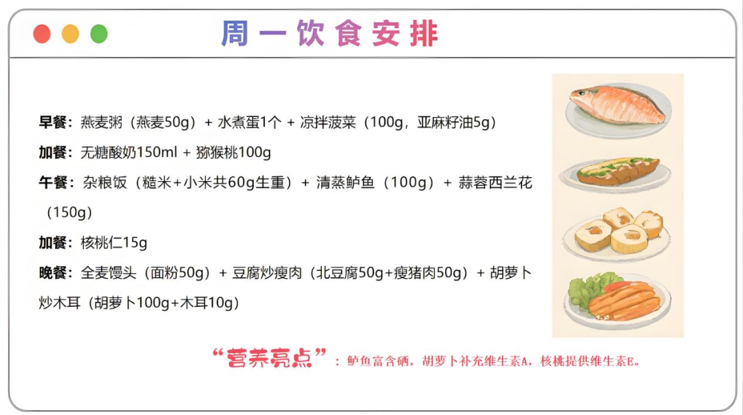 下面是奇山医院专家定制的一周食谱示例,供大家参考(以65岁,体重60kg,女性为例):