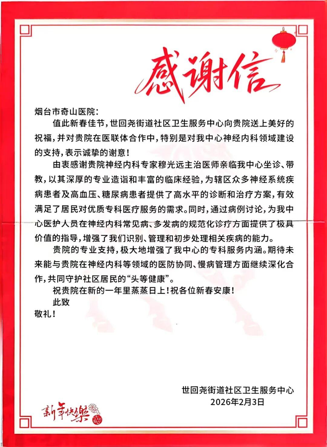 新春佳节之际,烟台市奇山医院收到了一份暖心的节日礼物——世回尧街道社区卫生服务中心发来的感谢信。信中对奇山医院在紧密型医联体建设中给予的实质支持,特别是在神经内科专科能力提升方面所做的贡献,表示了诚挚的感谢。