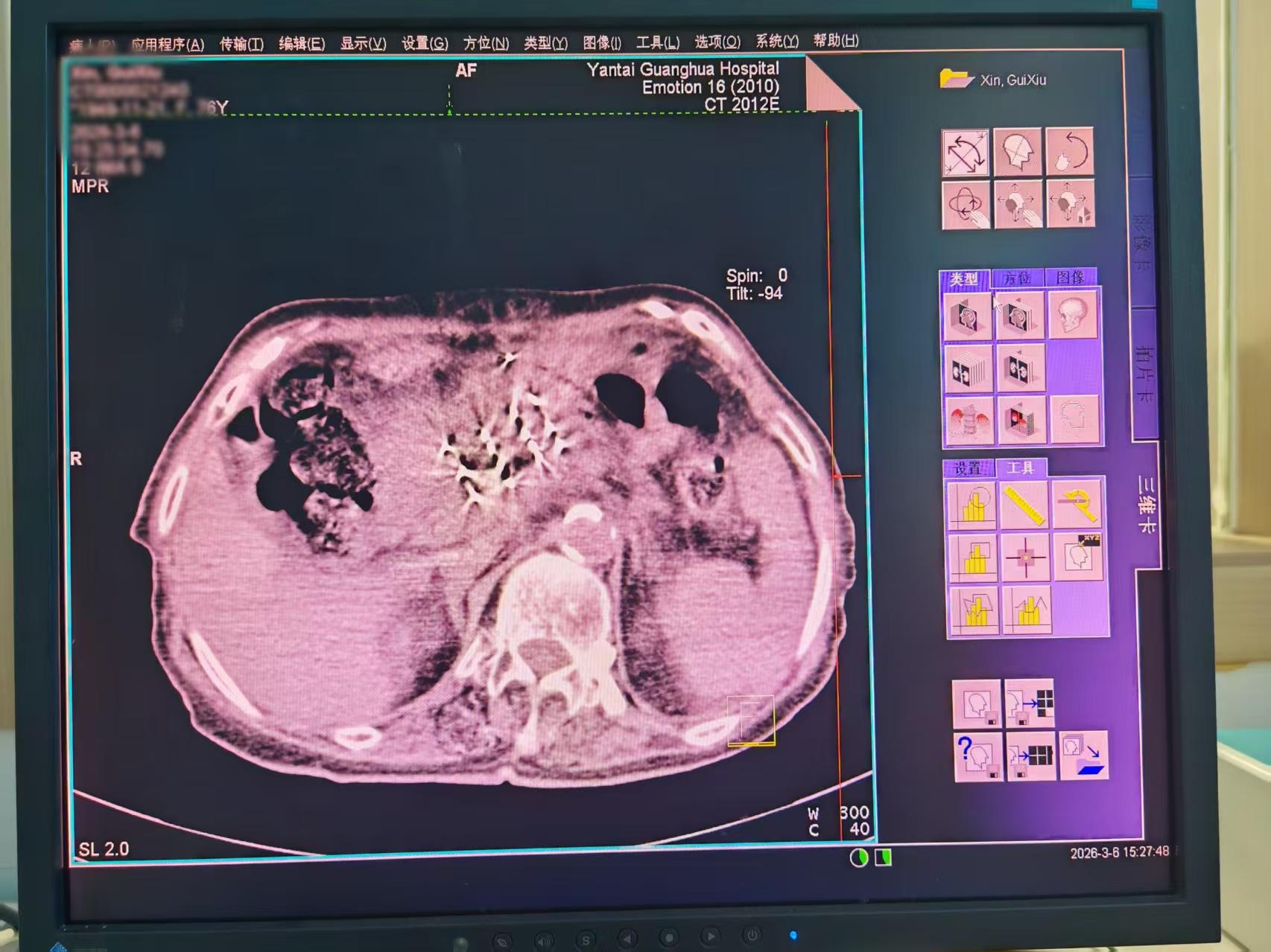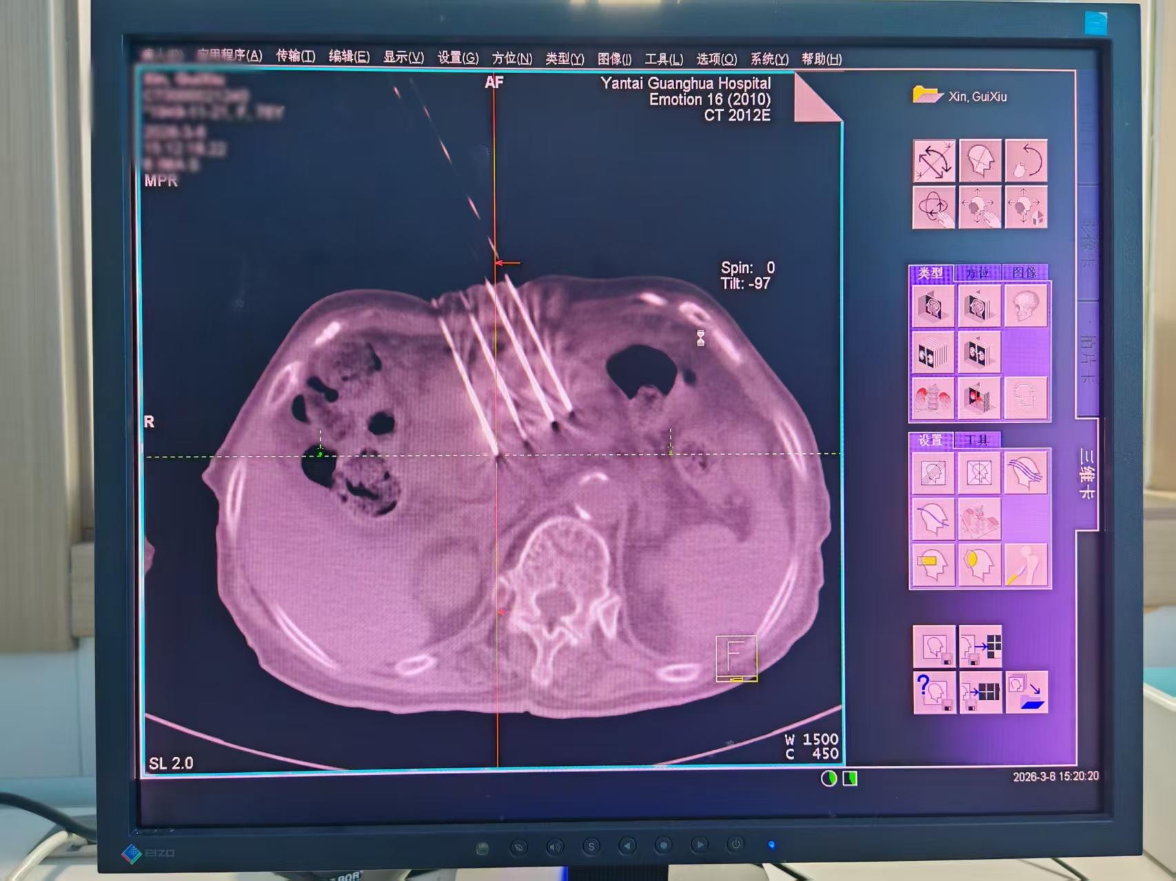 胰腺癌因位置深在、周围解剖结构复杂,被称为 “癌王”,尤其经皮穿刺粒子植入需避开胃、肠等器官及密集血管,手术难度极高。参加手术的陈永波副主任医师对记者说:为确保手术安全,团队术前通过螺旋 CT 扫描精准定位肿瘤边界,利用先进的系统优化粒子分布。CT和激光定位准确,同时严格控制周围正常组织受量。